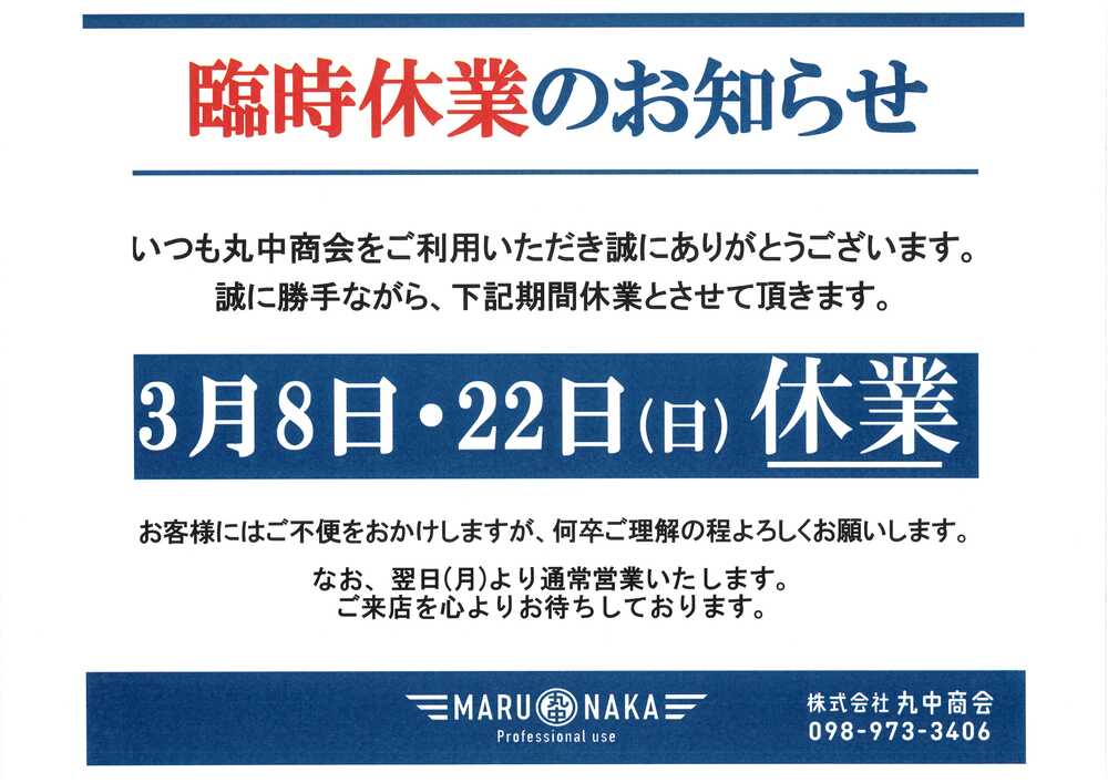 2026年3月8日(日)・3月22日(日)臨時休業のお知らせ